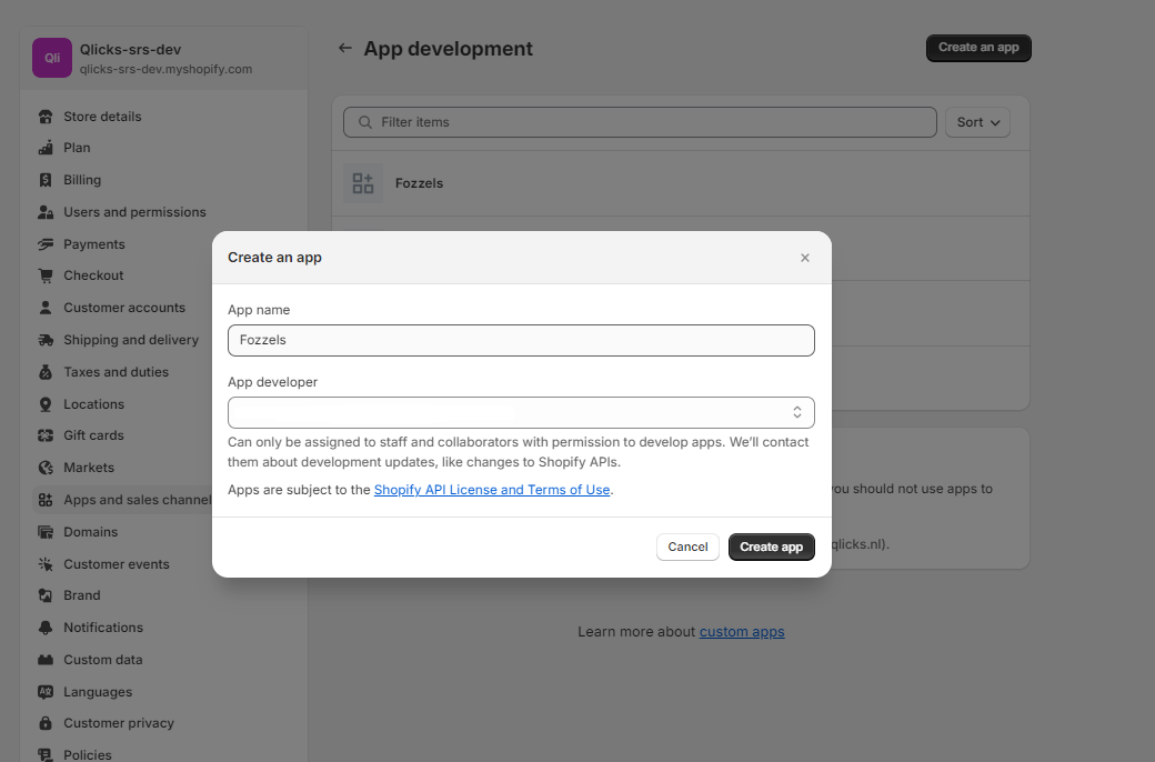6. Fill in App name (Fozzels) and choose your account in the developer section at the "Create an app" pop-up.