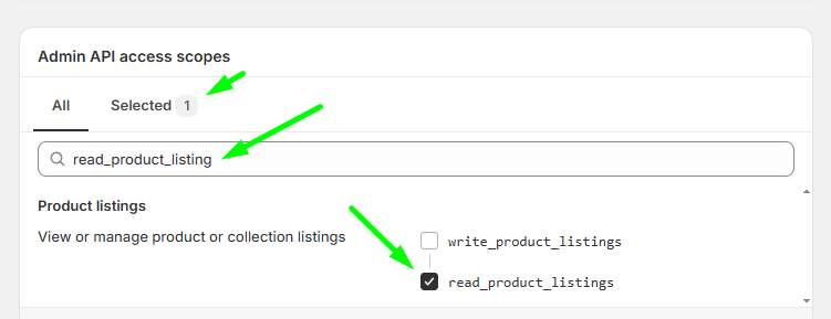 2. Enable the following required permissions using the search input: read_product_listings , read_products , write_products , read_metaobject_definitions , read_metaobjects , read_product_feeds .