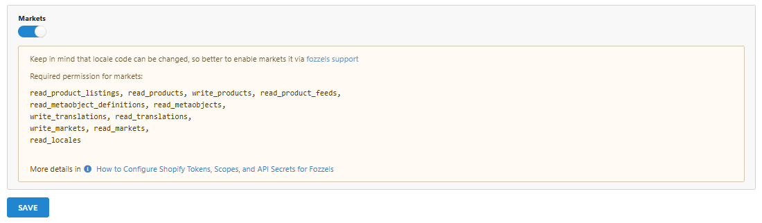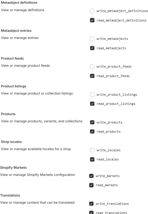 3. Attention! If you are utilizing Markets in Shopify to manage different regions or countries, you must also add the following permissions: write_translations , read_translations , write_markets , read_markets , read_locales .