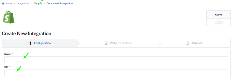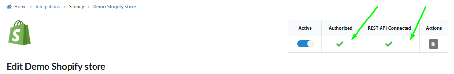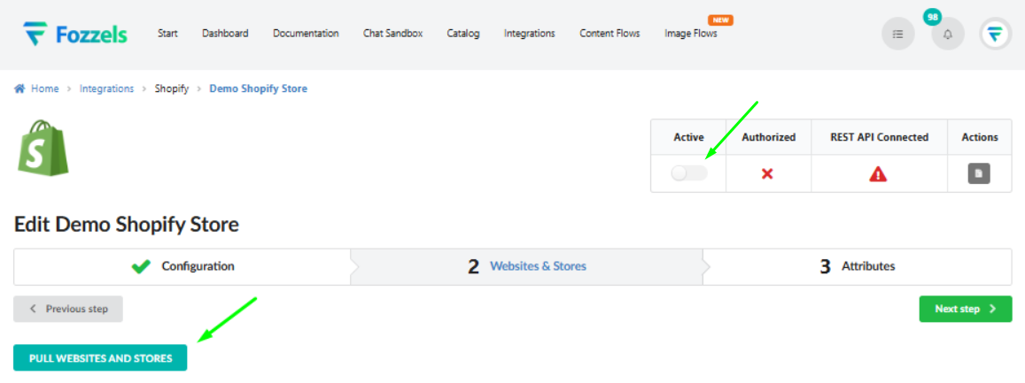 Make sure that the integration has the following statuses and that the current websites and stores are displayed: