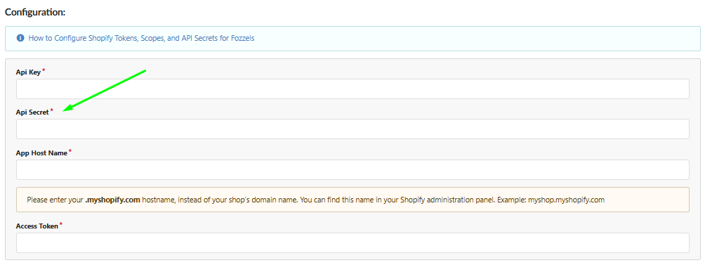 7.2. Paste API Secret key Shopify into the API Secret Fozzels field.