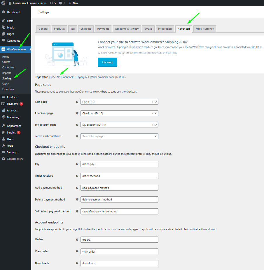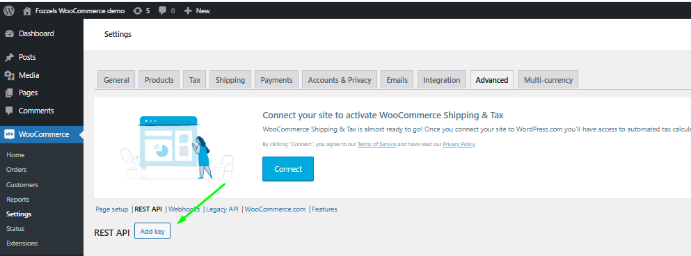 1. Go to the "Settings" / Advanced / REST API tab in the main WooCommerce menu.