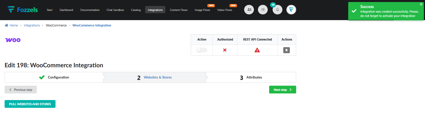 After successful saving, you will proceed to the next configuration steps in Fozzels ("Websites & Stores" and "Attributes"), where you can set up product and attribute synchronization.