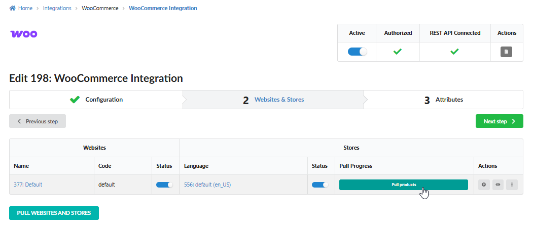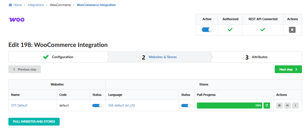 1. Click the "Pull Websites and Stores" button. This will retrieve and display all associated websites and stores from your WooCommerce account.