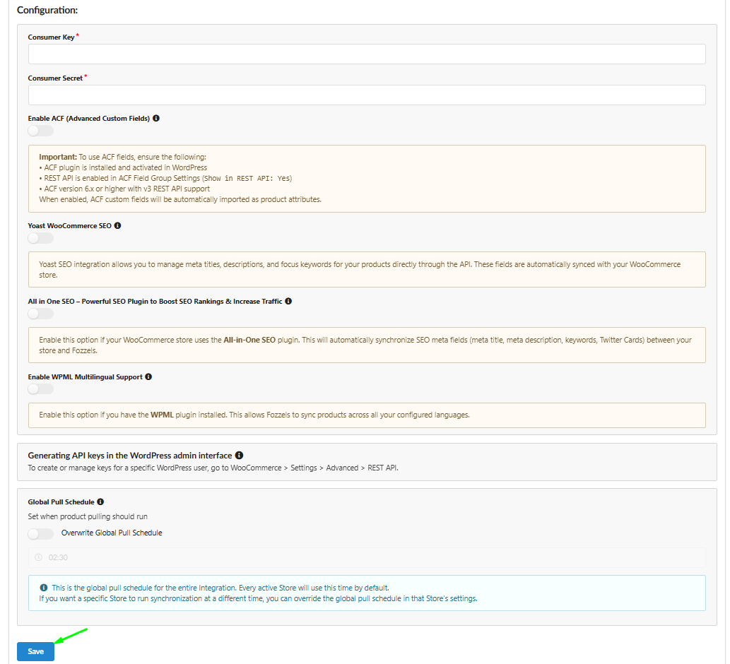 7. If you want Advanced Custom Fields to also be imported into Fozzels, please enable the Enable ACF toggle. Read more about how to properly set up this connection in the Enabling ACF Data Sync: WordPress/WooCommerce Configuration for Fozzels.