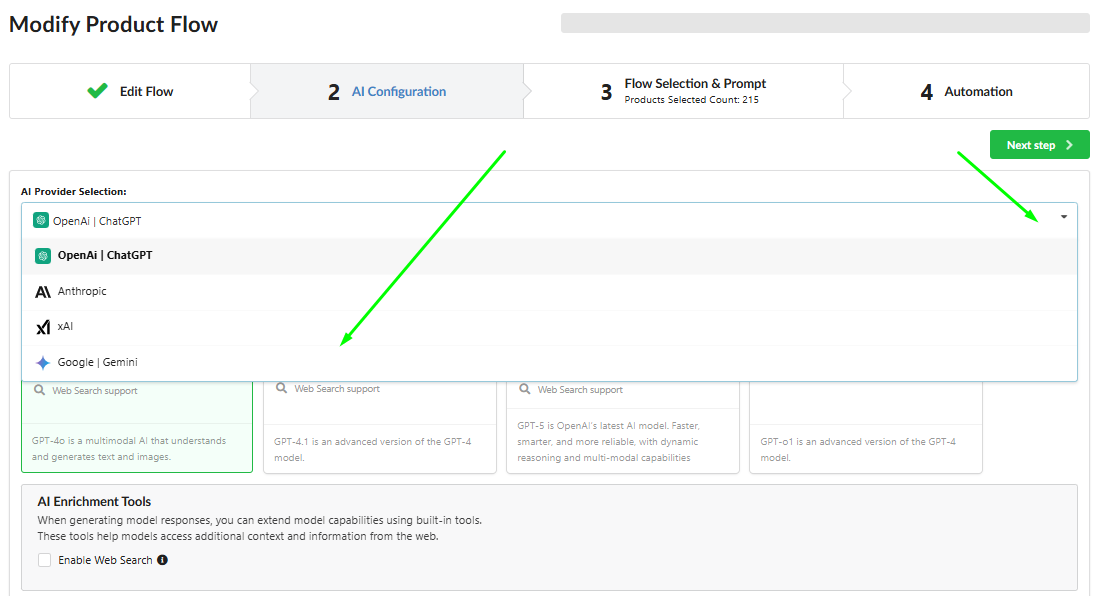 Select the desired AI model (e.g., GPT-4o (new) or Gemini 2.5 Flash Preview) by clicking the corresponding tile.