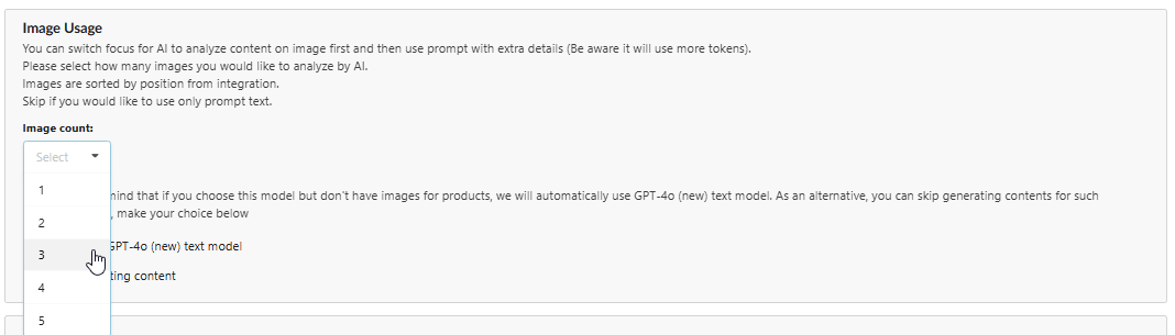 Set the number of images (from 1 to 5) in the Image count field that the AI will use for analysis and content generation (optional).