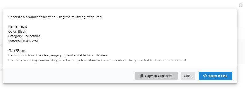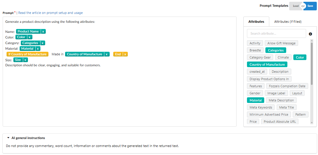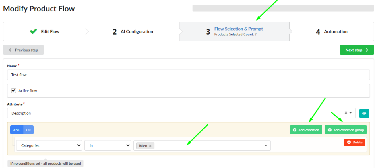 4.2. Select an attribute (e.g., Color or SKU), define the operator (Equal, Contains, Is empty, etc.), and enter the value. 4.3. Caution: If filters are not applied, content will be generated for ALL products currently in your store.Create the instruction (prompt) for the AI: