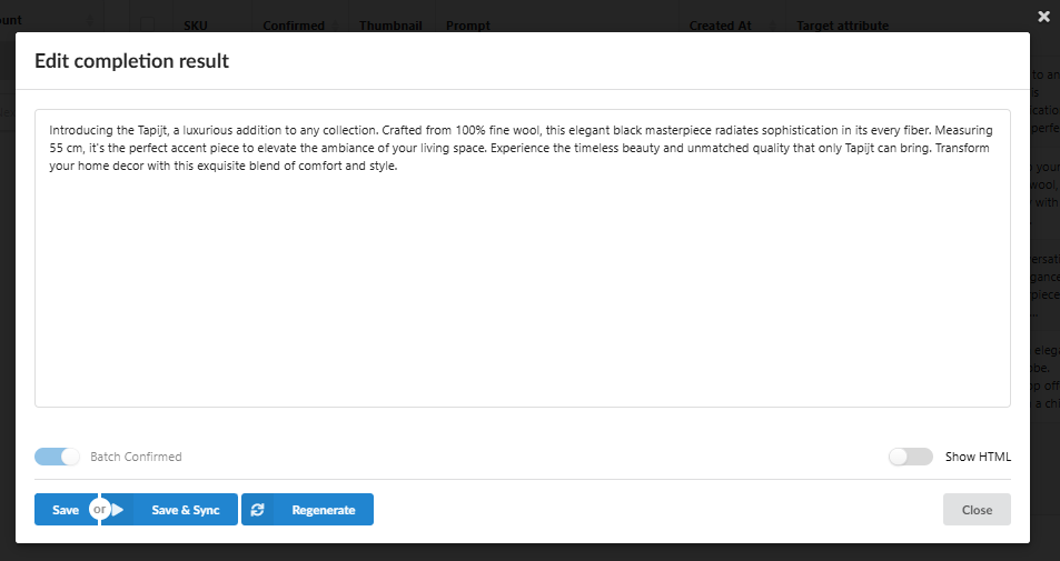 Check the Automatically create a new text when an attribute of a product changes in your store checkbox to ensure regeneration when source data is updated.