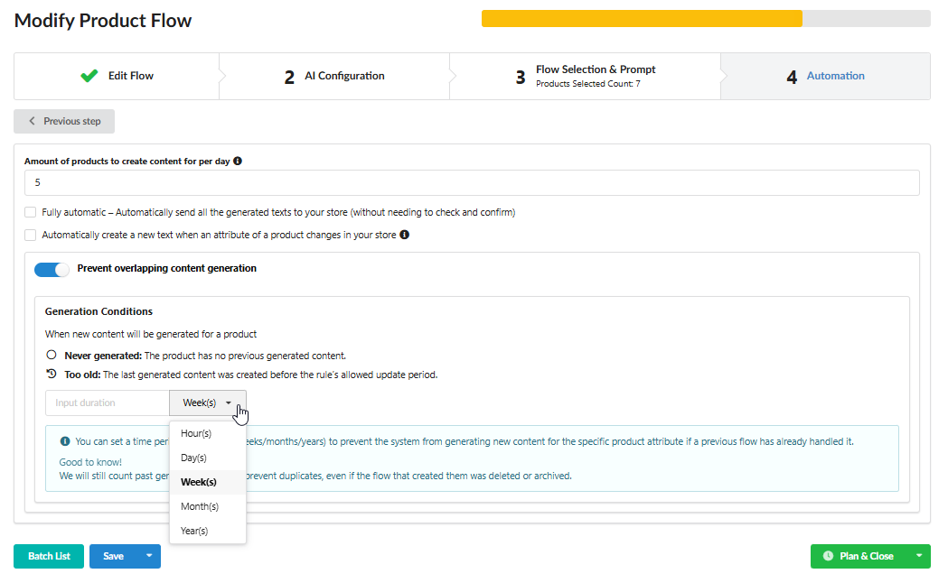 You can set a time period (hours, days, weeks, months, or years) to prevent the system from generating new content for the specific product attribute if a previous flow has already handled it.