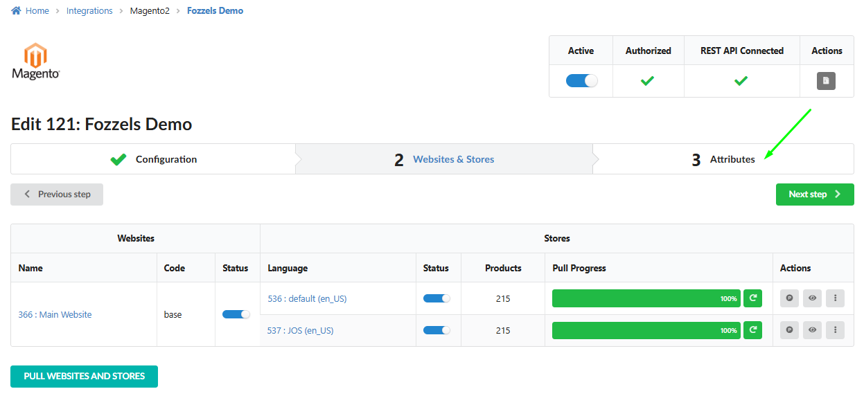 Go to your integration settings and select the Websites & Stores tab.