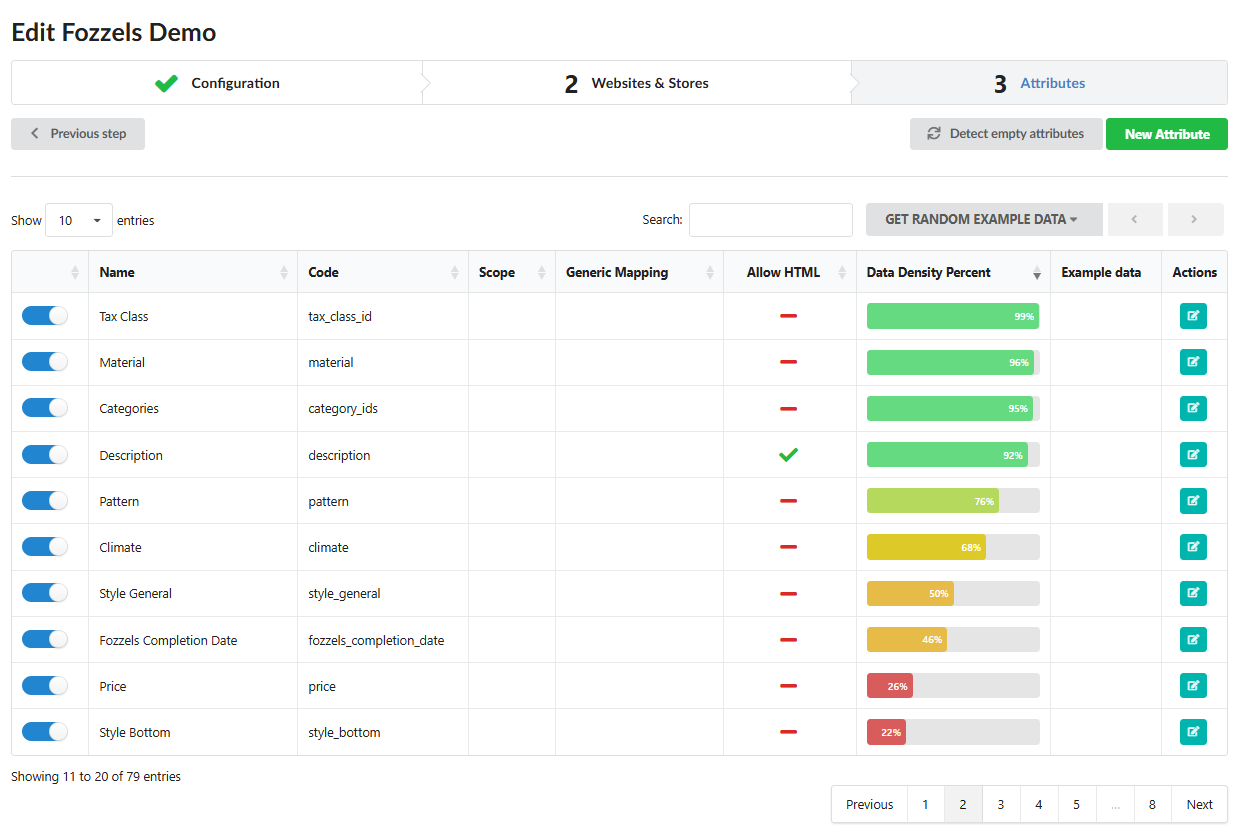 This document provides both a conceptual overview and detailed practical instructions on the complete lifecycle of product Attributes within the Fozzels platform: from initial import and analysis to advanced configuration, transformation, and custom field creation.