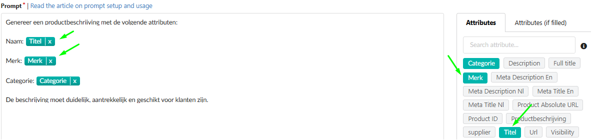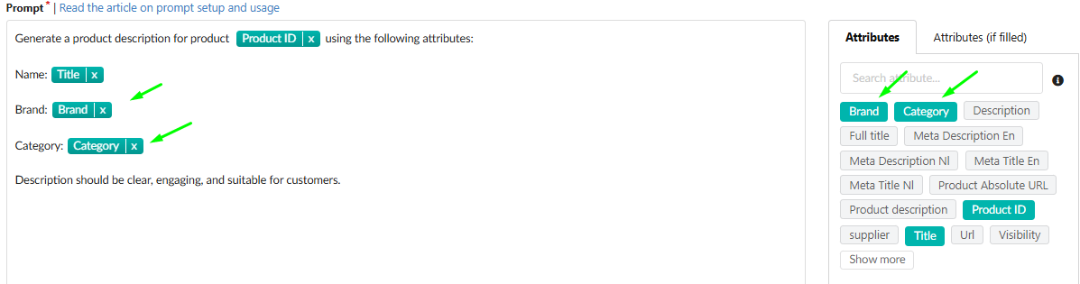 ) imported from your integrated platform. They serve as input variables for the Prompt Field, allowing the generation of unique content for each product.