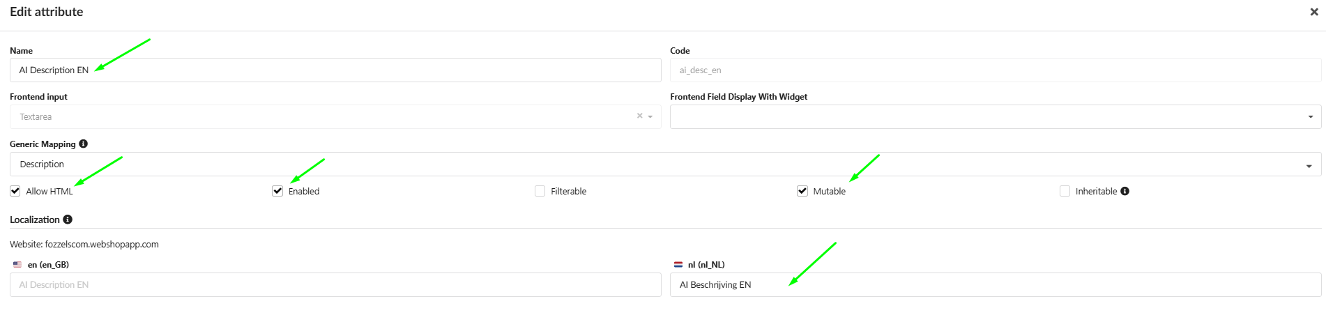 Inheritable: Determines whether the attribute value of a parent product should automatically be copied to its child variants.