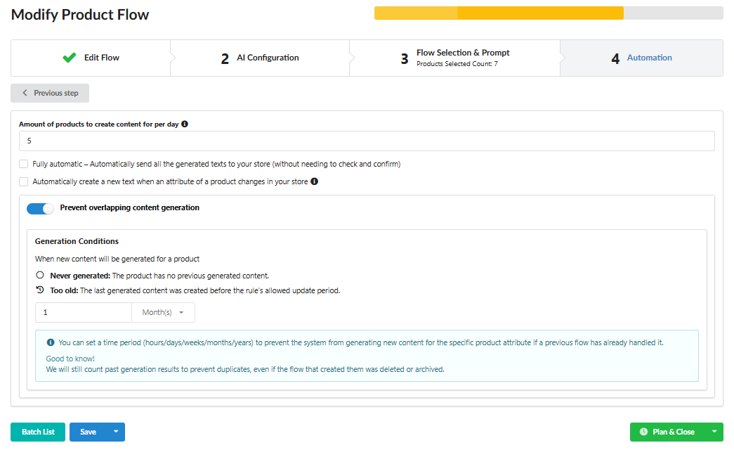 We are pleased to introduce the new Prevent overlapping content generation feature, designed to enhance the efficiency of your content generation processes. This function allows to control and optimize token usage by preventing redundant (repeated) generation of new content for the same product attribute if it has recently been processed by another Flow.