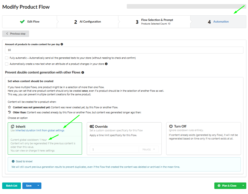 The "Prevent double content generation with other Flows" feature is crucial for ensuring you do not generate content twice for the same product when it might belong to multiple Flows. This helps optimize your AI usage (tokens) costs .