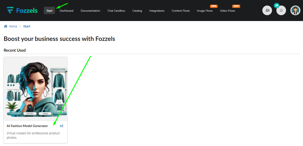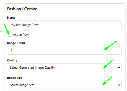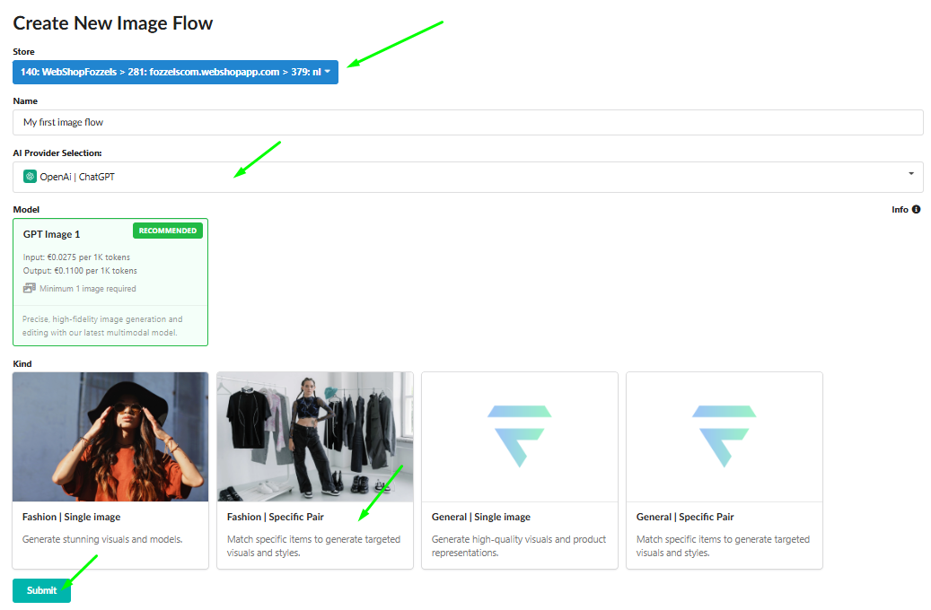 The Image Flow is a powerful marketing tool that allows you to generate unique images for individual products or their combinations (pairs) using AI. Fozzels supports various Flow types, including Fashion and General Flows.