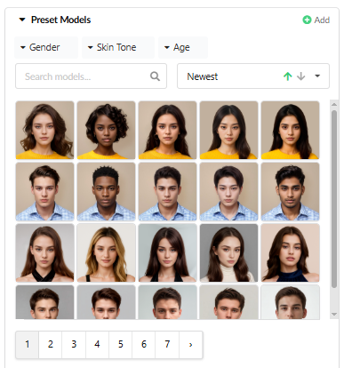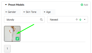 Select the model for generation. Use the available filters (Gender, Skin Tone, Age) for a quick search.