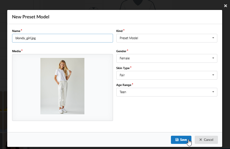 3.2. Select and upload your image file (must bejpeg,png,webp; max size 10 MB).Select the relevant metadata from the dropdown fields (Gender, Skin Tone, Age Range) if the Kind is Preset Model.