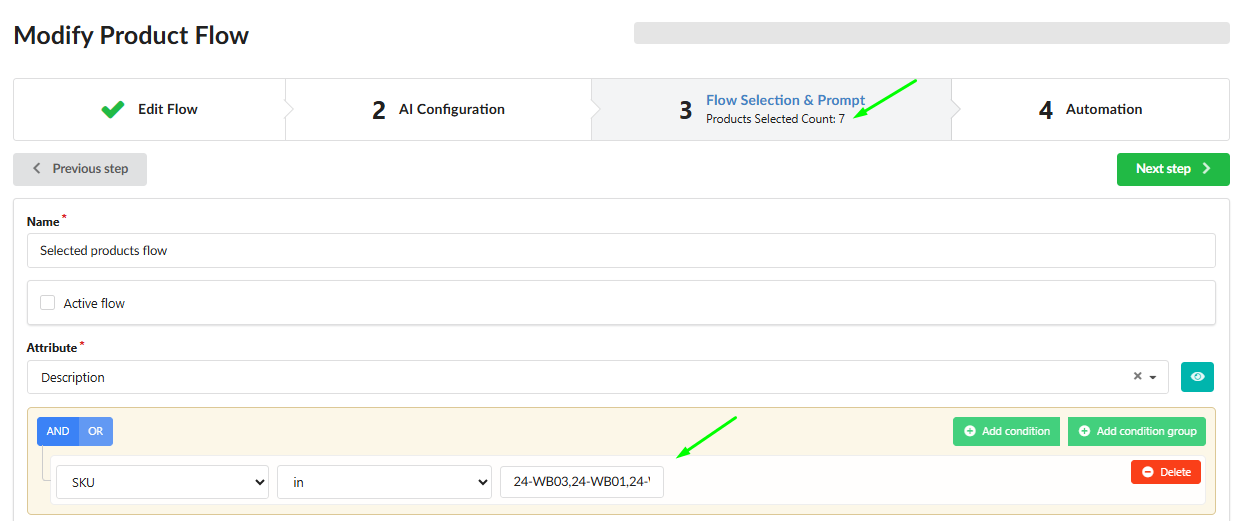 Automatic Initialization: The selected store will be automatically chosen, and all selected products will be used as the target set, populating the necessary Flow creation step.