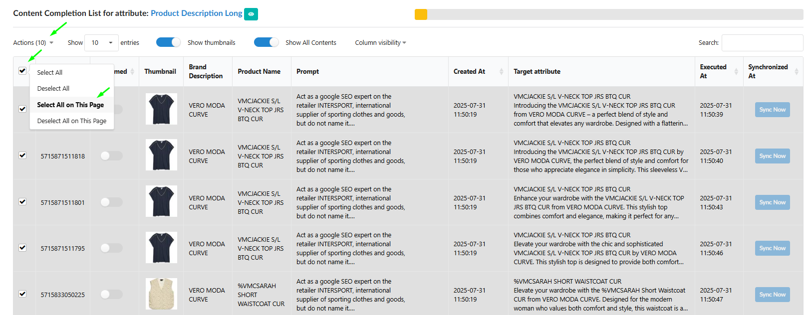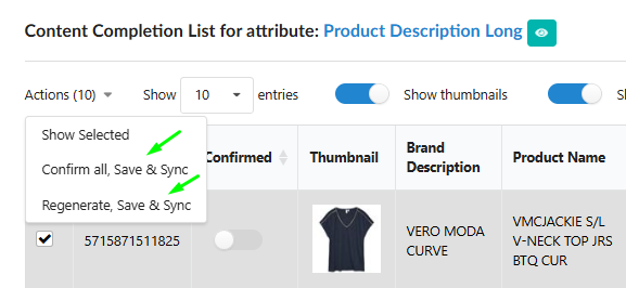 Confirm all, Save & Sync: This action simultaneously confirms the quality of the selected content and initiates its immediate synchronization to the integrated e-commerce store.