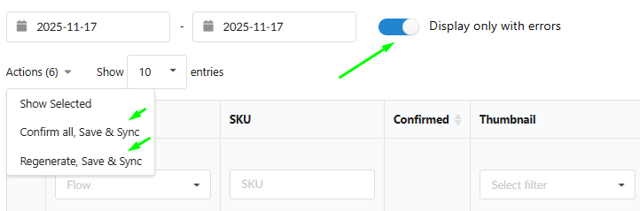 Quick Regeneration: After applying the filter and selecting the problematic items, use the "Regenerate, Save & Sync" action to efficiently re-run the generation process for all faulty elements simultaneously.