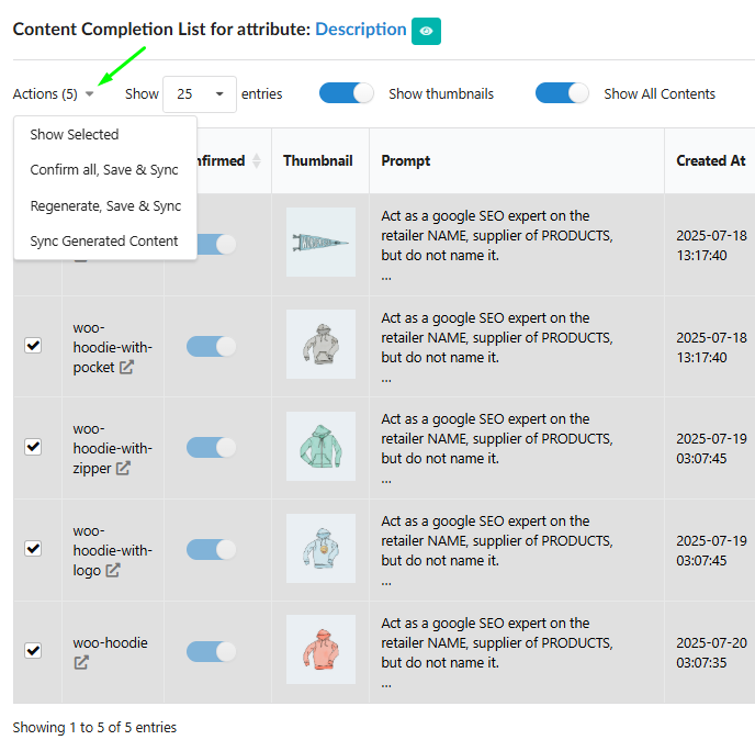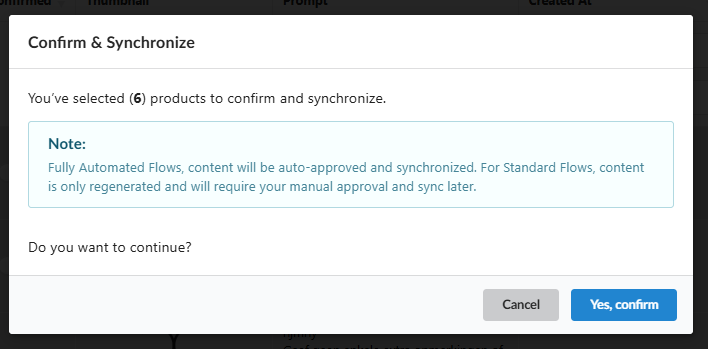 Regenerate, Save & Sync: This initiates a new content generation request for the selected products and automatically schedules their subsequent synchronization upon successful completion.