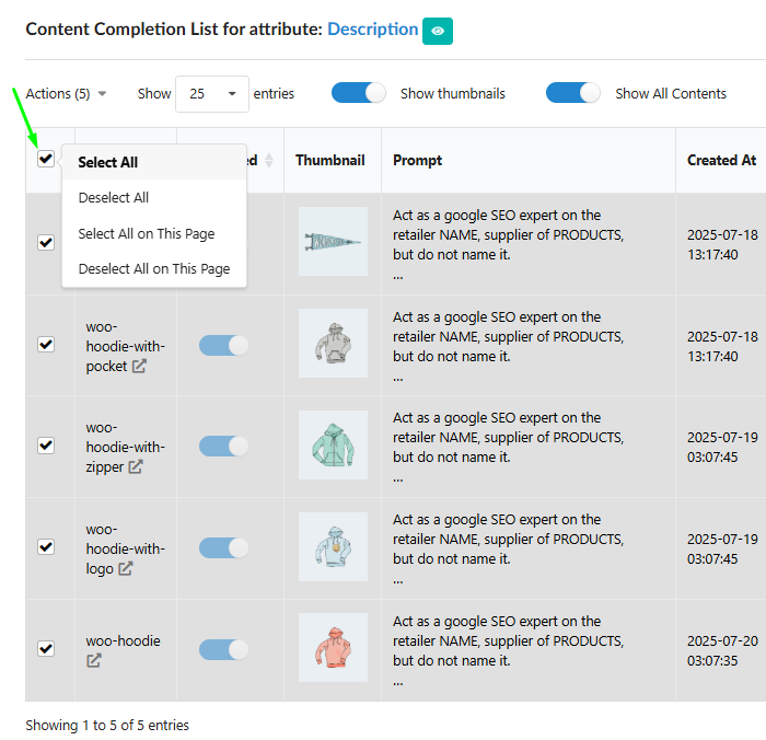 Sync Generated Content: This initiates the automatic transfer of all finalized content for the selected products to your connected e-commerce platform without triggering a new generation cycle.
