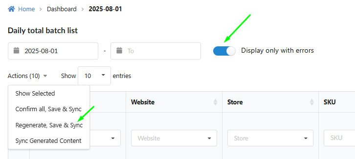 Managing Content Using Mass Actions The Dashboards (or Batch List) is your primary tool for rapidly managing content. This Mass Actions functionality is available in both the Daily Total Batch List overview and the detailed Batch List view. Using the Mass Actions function, you can simultaneously apply critical operations, such as Confirmation, Regeneration, and Synchronization, to a large number of products. This significantly saves time by eliminating the need to process each item individually.