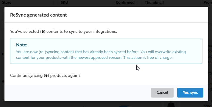 Mandatory Confirmation Pop-up: Before executing actions like "Resync Generated Content", "Confirm & Synchronize" or "Regenerate & Synchronize," a warning pop-up appears, requiring your explicit confirmation.
