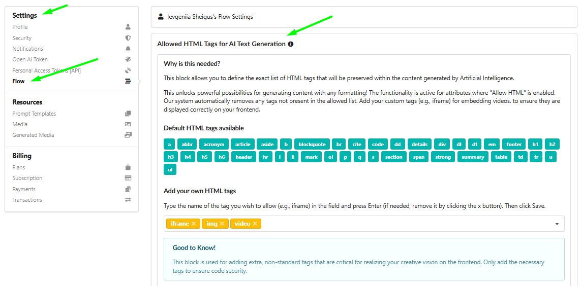 This feature allows you to precisely define which HTML tags can be used and preserved within the content generated by Artificial Intelligence. This functionality is active for attributes where the "Allow HTML" option is enabled.