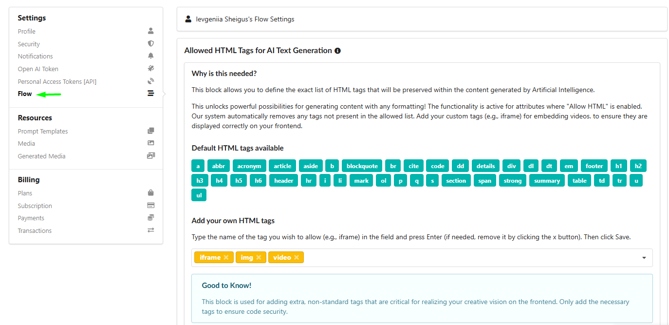 Where to find: Settings → Resources → Flow → Allowed HTML Tags for AI Text Generation.