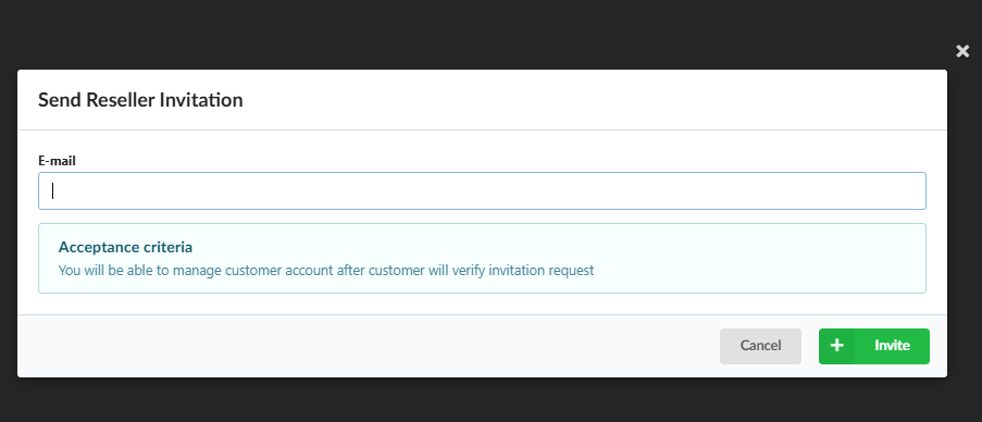 The Reseller enters your Customer account's Email into the "Send Reseller Invitation" pop-up and clicks 'Invite'.