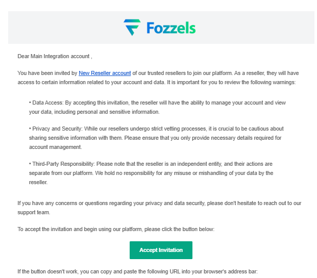 Delegation of Responsibility: By accepting the invitation, you delegate full operational responsibility for all actions performed in that account. The Reseller can modify or delete critical data and integrations.