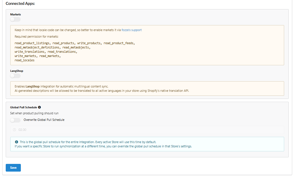 13.2. Enable the Markets or LangShop toggles if you need to synchronize content across multiple markets or languages.