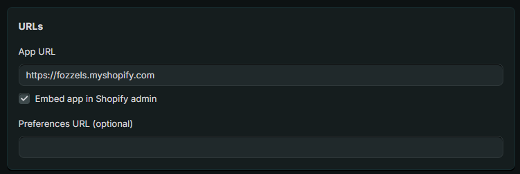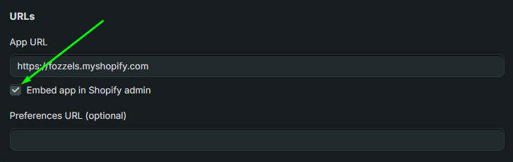 Embedded Interface: “Embed app in Shopify admin” is enabled (required for Fozzels).