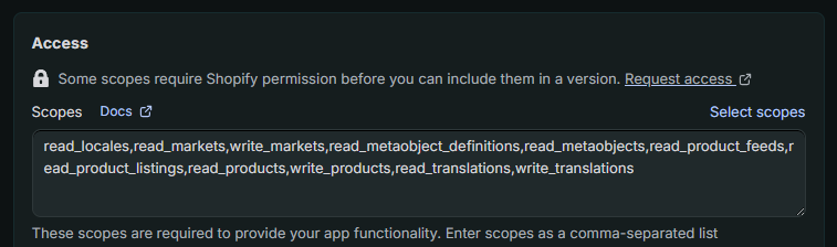 This list is mandatory for all store types, including stores using Shopify Markets and Language Pages.Products: read_product_listings, read_products, write_products, read_product_feeds.