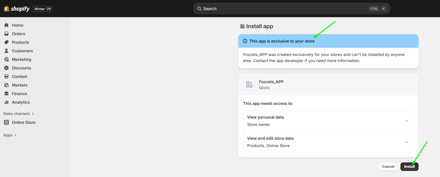 10.9. You will be redirected to the Install app page in your store admin.